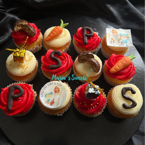 12 heerlijk luchtige mini cupcakes, afgewerkt met botercreme en decoratie zoals foto.